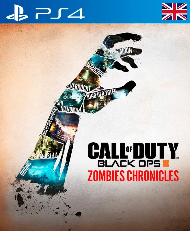 Call of Duty Black Ops III Zombies Chronicles DLC Region USA PS4 OBLIGATORIO TENER EL JUEGO PRINCIPAL REGION USA NO INCLUYE JUEGO , ES SOLO DLC . Compra Zombies Chronicles y consigue: Zombies Chronicles incluye 8 mapas clásicos de Zombis remasterizados 3 mapas de Call of Duty®: World at War: Nacht der Untoten, Verrückt y Shi No Numa 4 mapas de Call of Duty®: Black Ops: Kino Der Toten, Ascension, Shangri-la y Moon 1 mapa de Call of Duty®: Black Ops II: Origins.